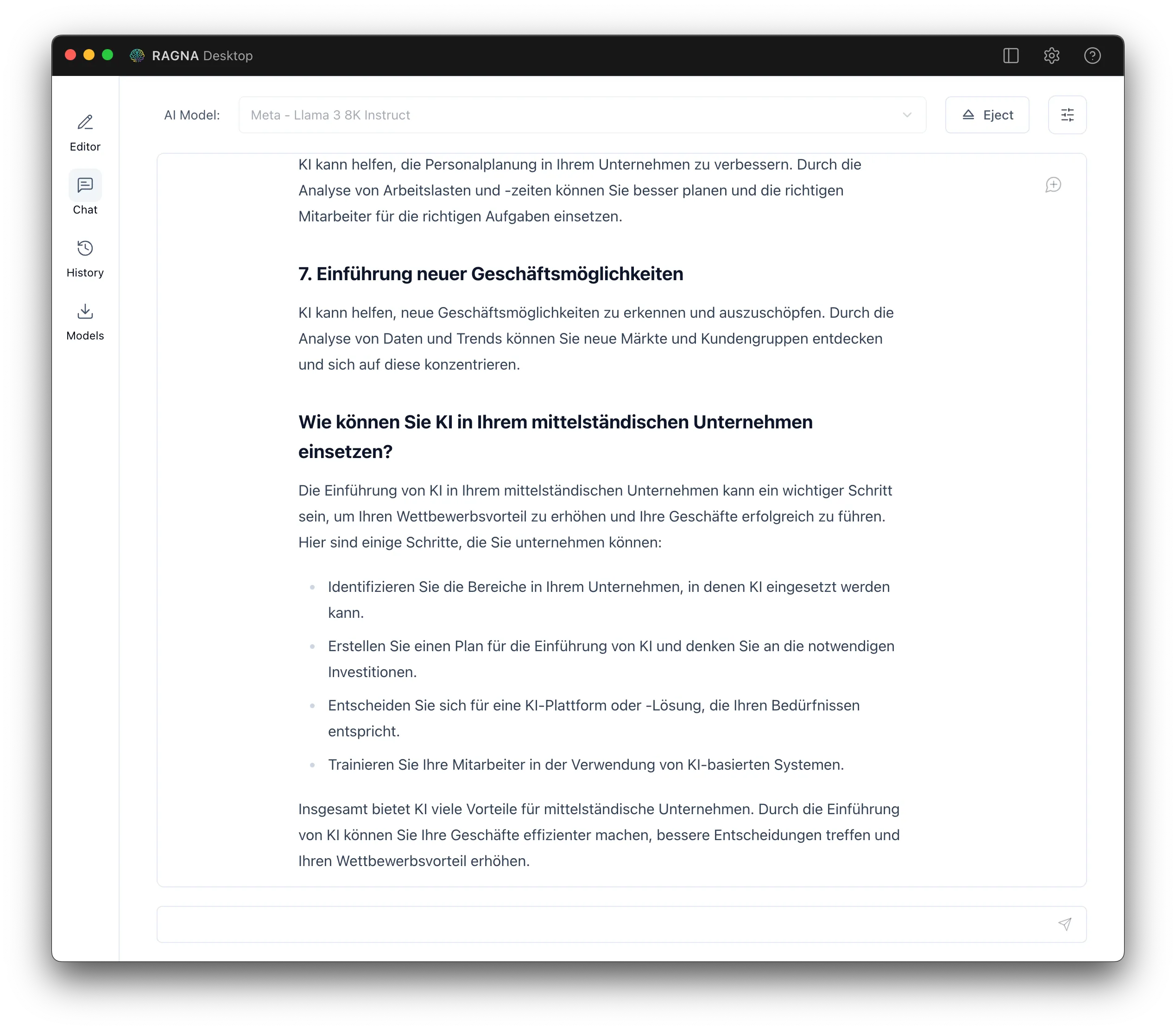 RAGNA Nano ist ein privates KI-Multitool, das lokal auf Ihrem Desktop PC oder Laptop läuft, ganz ohne Internetverbindung. Die App wurde entwickelt, um Ihnen zu helfen, repetitive Aufgaben zu automatisieren, die Effizienz zu steigern und Kapazitäten für die wirklich wichtigen Dinge freizusetzen.